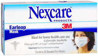 1. Hold Nexcare Earloop Mask so blue side is facing out. 2. Place mask over nose and mouth, and place an earloop around each ear. 3. Pull bottom of mask under chin and mold the nosepiece around the nose. The mask should cover face from the nose to underneath the chin. 4. Discard the mask after each use.