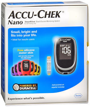 Small in size, big in performance. No coding. Brilliant backlit display. Discover how to lower your A1C 1-click lancing device with a drum. Lancet lever makes it easy to advance to a new lancet 11 customizable depth settings for different skin types. FastClix drum with 6 preloaded lancets. Use with Accu-Chek SmartView test strips. Small 0.6-mcL sample size means less blood. Fast, accurate results in 5 seconds. Pre- and post-meal markers help you see how food affects your blood glucose. Option for non-fingertip testing*. *Talk with your healthcare professional before deciding if alternate site testing is right for you. Contains: Accu-Chek Nano blood glucose monitor (batteries included with preset time and date); Accu-Chek FastClix lancing device with 12 lancets (2 drums); easy-to-use instructions (English and Spanish); carrying case; tool kit guide and video.