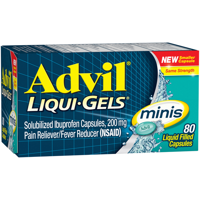 Temporarily relieves minor aches and pains due to: headache; toothache; backache; menstrual cramps; the common cold; muscular aches; minor pain or arthritis. Temporarily reduces fever. 80 liquid filled capsules. Same strength. Smaller capsule size.