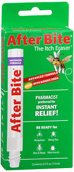 For the temporary relief of pain and itching associated with: insect bites and stings; minor skin irritation and rashes. Easy to use pen-like appilcator - and convenient to carry. Pack After Bite in your handbag, first aid kit, glove compartment, golf bag or the family camping gear. Get fast, complete relief from the pain and itching associated with insect bites and stings and other minor skin irritations with After Bite The Itch Eraser. Mosquitoes, black flies, plus: fleas, no-see-ums, chiggers, horse flies and other biting/stinging insects.
