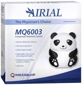 Aerosol medication therapy for the effective treatment of: bronchial asthma, acute bronchitis, chronic bronchitis, emphysema, pneumoconiosis, cystic fibrosis, bronchiectasis, chronic obstructive pulmonary disease, tracheitis, pulmonary infections, small airway disease, respiratory infections, and other upper respiratory conditions. Effective medication delivery. Ultra quiet operation. Pacifier attachment and child's mask included. Friendly character design is ideal for children. Latex-free. Lifetime warranty. Package contents: panda compressor and convenient carrying case, child's mask, air tube, pacifier interface, nebulizer cup. Includes: 5 air filters and complete instructions.