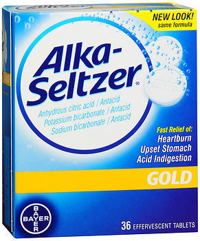 For the relief of: heartburn, acid indigestion, sour stomach. Less sodium than Alka-Seltzer original. Take any time - morning, noon, or night - when you need relief. This product does not contain aspirin. Alka-Seltzer Gold in water contains principally the antacids sodium citrate and potassium citrate.