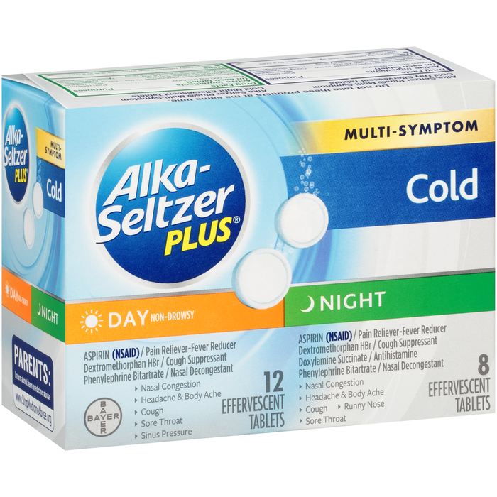 Day: Temporarily relieves these symptoms due to a cold: Minor aches and pains; Headache; Cough; Nasal and sinus congestion Sore throat. Temporarily reduces fever. Night: Temporarily relieves these symptoms due to a cold: Minor aches and pains; Headache; Runny nose; Sinus congestion and pressure; Cough; Sneezing; Sore throat; Nasal congestion. Temporarily reduces fever. Day: Non-drowsy. 12 day and 8 night effervescent tablets.