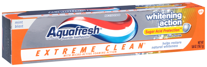 Aids in the prevention of dental cavities. With all the Triple Protection of Aquafresh, Extreme Clean's dynamic Micro-Active Foam showers your whole mouth with germ killing bubbles, helps to protect teeth with fluoride, and helps to maintain healthy gums with regular brushing. Our professionally developed micro polishing system carefully polishes teeth smooth making them stay cleaner and whiter for longer* and seeks out hard to reach places - in between teeth and even the back of your tongue - fighting the sources of bad breath. Aquafresh Extreme Clean Whitening Action rinses clean and clear, leaving nothing behind but polished, clean, white teeth and has a distinctive invigorating mint flavor that leaves an icy cool, sparkling feeling long after you brush. *Scientific testing shows that after only one tube you'll be left with significantly cleaner, smoother teeth than with a regular toothpaste!