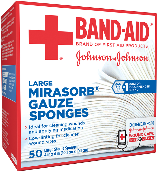 Use Johnson & Johnson Band-Aid’s large, sterile Mirasorb Gauze Sponges to clean cuts, burns and scrapes. Because they contain a low amount of lint and feature thick cushioning, these sponges superbly and comfortably clean wounds. Mirasorb Gauze Sponges are also effective for applying medication or ointment to wound sites, as well as absorbing fluids and blood, pulling them away from the injury.Ideal for use in cleaning and applying medication to minor cuts, scrapes, and burns. Low-linting for cleaner wound sites. The pillow-soft cushioning offers extra comfort when cleaning dirt and contaminants from the injured area. Can also be used as absorbent dressings and offer Quick-Loc technology that instantly absorbs and pulls fluids away from the wound. Sterile. Not made with natural rubber latex.
