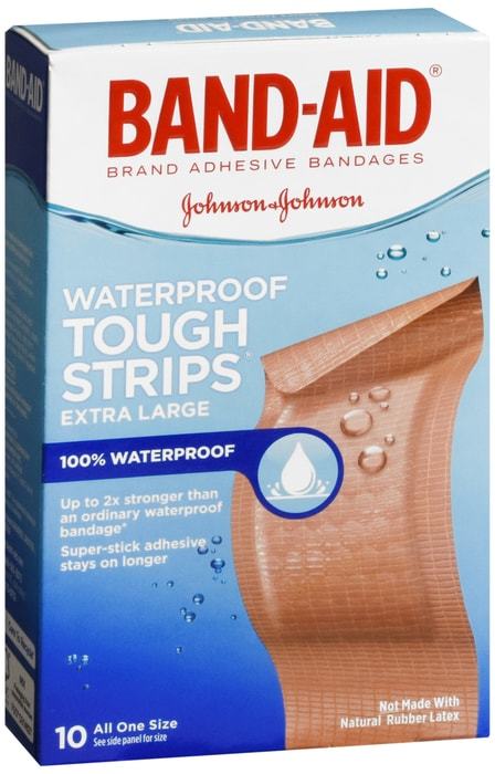 A covered wound heals faster than an uncovered one. Inside every waterproof Tough Strips bandage you'll find these unique technologies: 100% waterproof: Shields out water, dirt and germs even when wet. Durability: Up to 2x stronger than an ordinary waterproof bandage.* Superior adhesion: Super-stick adhesive to stay on longer. Sterile unless individual wrapper is opened or damaged. Not made with natural rubber latex. 1-3/4 in x 4 in. (4.4 cm x 10.1 cm). *Compared to BAND-AID Brand Water Block adhesive bandages.
