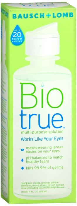 For soft contact lenses including silicone hydrogel lenses. The world can be tough on your eyes when you wear contact lenses. In a world of less sleep and more computer use it can be difficult for your eyes to stay comfortable and moist, especially when wearing contacts. This multi-purpose solution makes wearing contact lenses easier on your eyes. Biotrue is easier on your eyes because it works like your eyes. It has the same pH as healthy tears and a lubricant found in your eyes. Up to 20 hours of moisture.* Kills 99.9% of germs. Conditions, cleans, removes protein, disinfects, rinses, stores. Sterile. *Our laboratory research shows that Biotrue multi-purpose solution helps keep lenses moist for up to 20 hours.