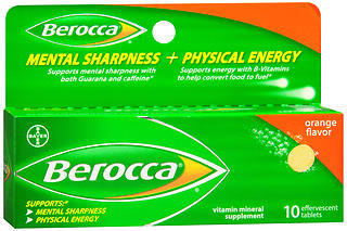1 effervescent tablet: Calories 5; Vitamin A 500 IU (100% as beta-carotene); Vitamin C 1000 mg; Thiamin (B1) 15 mg; Riboflavin (B2) 15 mg; Niacin 50 mg; Vitamin B6 10 mg; Folic Acid 400 mcg; Vitamin B12 10 mcg; Biotin 150 mcg; Pantothenic Acid 23 mg; Calcium 50 mg (Elemental); Magnesium 50 mg; Zinc 10 mg; Sodium 260 mg; Potassium < 5 mg; Guarana Extract 89.45 mg (Seed). (*Daily Value not established); Caffeine 44 mg (*); Citric Acid; Ascorbic Acid; Sodium Bicarbonate; Maltodextrin; Magnesium Sulfate; Calcium Carbonate; Magnesium Carbonate; Caffeine; Polyvinylpolypyrrolidone; Less Than 2% of: Acesulfame Potassium; Aspartame; Beet Juice Powder; Beta-Carotene; Biotin; Calcium Pantothenate; Cyanocobalamin; Folic Acid; Guarana Extract; Mannitol; Natural and Artificial Flavors; Niacinamide; Polysorbate 60; Polyvinylpyrrolidone; Pyridoxine Hydrochloride; Riboflavin; Sodium Phosphate; Salt; Sodium Carbonate; Sorbitol; Thiamine Hydrochloride; Zinc Citrate