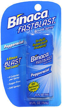 Binaca FASTBLAST breath spray kills bad breath germs and gives you an intense burst of flavor that hits you square in the mouth! Great tasting flavor leaves your mouth feeling cool and refreshed. Instant, long-lasting breath freshening - anytime, anywhere. Convenient size and flip-top cap for portability. Kills bad breath germs! 0 calories per spray. Sugar-free. 300 sprays.