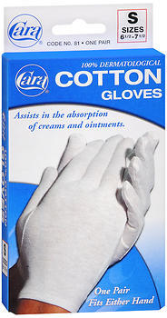 Elegant, comfortable, soft, sanitary protection for hands. 100% cotton, hypo-allergenic, hemmed for a neat appearance and packaged for easy access. Benefits the absorption of hand creams and medicated ointments. Conceals skin disorders. Prevents staining of fabrics and garments. One pair fits either hand. Fits sizes 6-1/2 - 7-1/2.