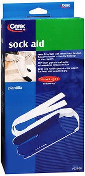 Great for people with limited hand function, back problems or recovering from hip or knee surgery. Terry cloth grips the sock while nylon reduces friction with foot. Large loop handles provide extra support for those with weakened grip. The simple task of putting socks or stockings can be a challenge for those who have trouble bending over at the waist. The Carex sock aid makes slipping on sock or stockings effortless.