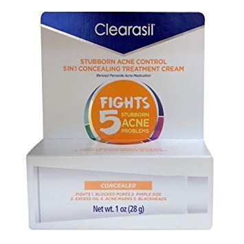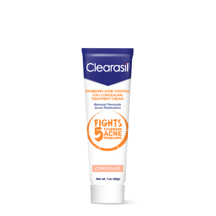 Dermatologist tested Clearasil® Stubborn Acne Control 5in1 Concealing Treatment Cream medication clears pimples and helps prevent new ones from forming. The tinted cream acne medication provides instant cover and its 24 hour control keeps working throughout the day. The cream contains maximum-strength acne medication, for clearer skin every day. FIGHTS 5 STUBBORN ACNE PROBLEMS: Blocked Pores, Pimple Size, Excess Oil, Acne Marks, and Blackheads. Clearasil's formula tackles pimples ABOVE & BELOW the skin surface! Use as needed to treat pimples that are forming. Contains benzoyl peroxide. Dermatologist tested.