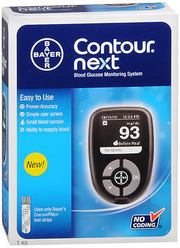 For self-testing, monitoring and management of blood glucose. No coding technology. Small blood sample - 0.6 microliters. Fast 5-second countdown. Ability to reapply blood. Simple markers: fasting, pre- and post-meal with adjustable testing reminders. More tracking knowledge with 7, 14, 30 and 90-day averages. Personalized settings. Proven accuracy. Simple user screen. Uses only Bayer's Contour Next test strips. Contains: Contour Next blood glucose meter; User guide and quick reference guide; Bayer's Microlet 2 lancing device; 10 Microlet colored labels; Logbook and carrying case; Warranty card; AST-cap.
