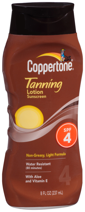 Coppertone SPF 4 Sunscreen Lotion provides Coppertone certified SPF protection from the sun's damaging UVA/UVB rays. This lightweight fast-absorbing lotion leaves no greasy residue on your skin. This non-greasy formula is also hypoallergenic and non-comedogenic so it won't clog pores or cause breakouts. Coppertone SPF 4 Sunscreen with Aloe and Vitamin E moisturizes your skin to help prevent peeling and dryness while helping to maintain healthy-looking skin. Coppertone SPF 4 Sunscreen provides waterproof protection and SPF protection you can trust. PABA free. Dermatologist tested. Many skin care experts recommend regular use of at least an SPF 15 to help reduce risks of sunburn, premature aging, wrinkling and skin cancer, especially if you burn easily or spend long periods of time in the sun.