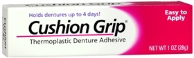 Cushion Grip Denture Adhesive is intended for use only on non-defective dentures. Ill-fitting, broken or irritating dentures may impair your health. Consult your dentist for periodic examination at least every six months. Keep out of the reach of children.