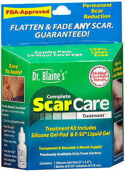(A): Silicone Gel Pad: Innovatively engineered as a self adhesive pad, there is no need for additional wraps or taping. The non-sticky side is smooth and soft to prevent fabrics from adhering. (B): E-Sil Solution: Vitamin E (a-Tocopherol) 50% skin antioxidant. Silicone Liquid Gel 50% together with Vitamin E helps promote healthy skin. Blaine ScarCare Gel Pad is transparent, easy to use, and comfortable to wear. It can be cut to fit the shape and size of any scar. Blaine ScarCare Gel Pad is washable and reusable. Its stickiness returns soon after washing! The pad should be replaced when it is no longer adhesive. Blaine ScarCare Gel Pad is made from the finest medical-grade silicone. When used properly the gel pad is guaranteed to flatten and fade your scar, or your money back (see package insert). System: Doctors and surgeons nationwide presently recommend this convenient 24 hour a day scar treatment to patients who are serious about treating their scars. Contents: Blaine ScarCare Gel Pad (2 in x 5.5 in) and one .5 fl. oz. bottle of E-Sil Solution.