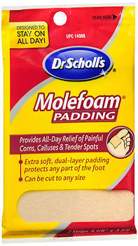 Bathe feet and dry thoroughly. Cut Molefoam to desired size and shape with scissors, then remove backing and apply to affected area. For blisters or broken skin, cut a piece to fit surrounding area. Do not place directly over blister or broken skin.