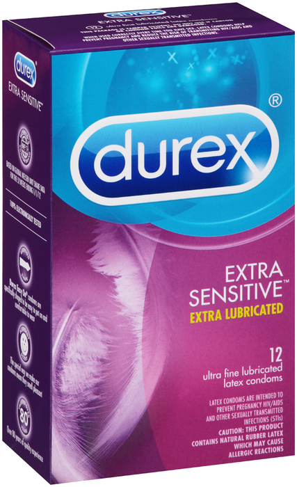 When used correctly every time you have sex, latex condoms help prevent pregnancy and reduce the risk of transmitting HIV/AIDS and other sexually transmitted infections. Durex Extra Sensitive condoms are ultra-thin with extra lube for heightened sensitivity. Thinner than standard condoms while providing the protection you need. Our condoms are specially made to have a pleasant scent. Fitted shape for easy-on and great feel. Each condom is electronically tested for reliability. Made from natural rubber latex. Reservoir end. Nominal width: 56 mm.