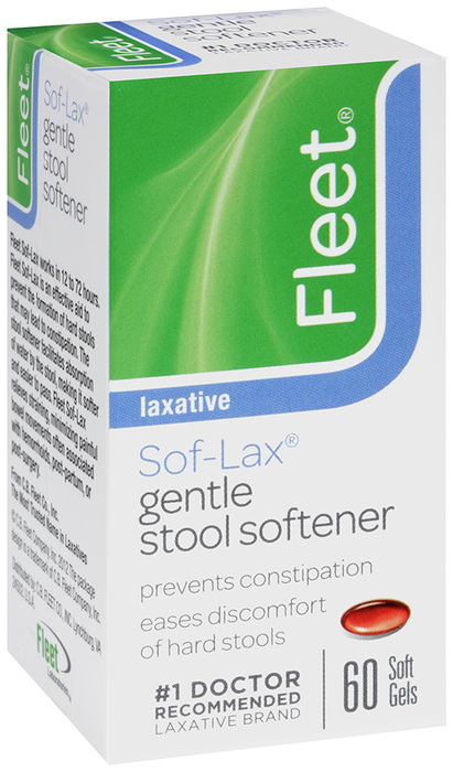 For the prevention of dry, hard stools. For relief of occasional constipation. Fleet Soft-lax is an effective aid to prevent the formation of hard stools that may lead to constipation. The stool softener facilitates absorption of water by the stool, making it softer and easier to pass. Fleet Soft-lax relieves straining, minimizing painful bowel movements often associated with hemorrhoids, post-partum, or post-surgery. Fleet Soft-lax works in 12 to 72 hours.
