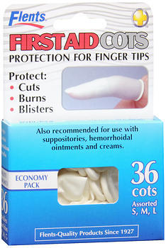 Flents Finger Cots provide temporary protection for your fingers while injuries are healing. Protect cuts, burns and blisters from moisture and dirt. Ideal for hard to bandage finger tips. For additional protection, a cot may be worn over a light bandage. Also recommended for use with suppositories, hemorrhoidal ointments and creams.