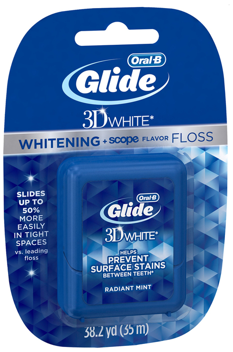 Glide Whitening Plus Scope Flavor delivers the cleaning and comfort you'd expect from Glide with an added splash of Scope flavor for a clean and refreshed feeling. Helps prevent stains in between teeth. Effectively removes plaque in between teeth and below the gumline. Silky smooth texture slides easily between teeth. Unique patented floss is strong and shred-resistant.