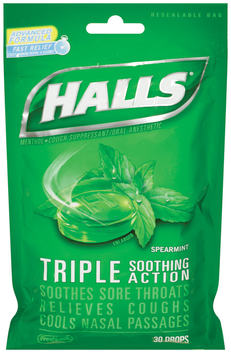 When you have a cold, you need immediate relief from the symptoms and that is just what Halls cough drops provide. Halls Cough Suppressant/Oral Anesthetic Drops are made with a triple soothing action formula to help get rid of sore throats, clear stuffy noses and eliminate coughing. The strong, but refreshing spearmint flavor also helps to penetrate congestion.