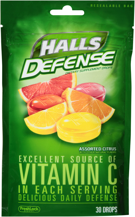 Halls Defense Vitamin C Supplement Drops help keep you going by helping to support your immune system**. Every delicious, fruit-flavored drop delivers 100% of the daily value of Vitamin C. Assorted Citrus Halls Defense Vitamin C Supplement Drops are available in the following all natural flavors: Lemon, Sweet Grapefruit, and Orange. Assortment in each package may vary. Also available from Halls Defense are Watermelon, Strawberry, and Harvest Cherry.
