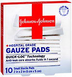 JOHNSON & JOHNSON First Aid Sterile Gauze* Pads are ideal for larger cuts, scrapes, and minor burns because they are highly absorbent to comfortably clean dirt and germs from the injured area and pull fluids away from the wound site. These pads are ideal for covering and protecting larger cuts, scrapes, and minor burns to help them heal. 10 sterile small pads measure 2 in x 2 in (5 cm x 5 cm). *Rayon/Polyester/Cellulose.
