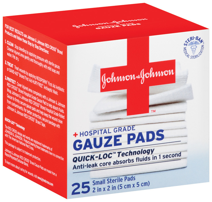 Johnson & Johnson Band-Aid’s small sterile gauze pads are perfect for minor cut, scrape and burn wound care. Designed to protect wounds better with 20% more absorbency, they are made with deep pockets to keep fluids and blood away from open wounds. This item is an essential staple in every first aid kit and includes 25 small, 2x2 pads.Ideal for cuts scrapes and burns. Designed for better protection. Now 20% more absorbent.* Quiltvent technology: Deep pockets that wick away blood and fluid to keep wounds clean. When using ointment, unique pockets help keep it in place. 8 double-thick layers of pillow-soft cushioning for extra comfort. Not made with natural rubber latex. 2 in x 2 in (5 cm x 5 cm). Sterile. *Compared to absorbency of previous Johnson & Johnson Red Cross gauze pads.