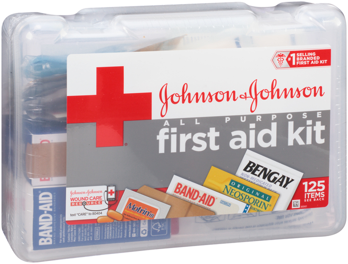 Original Neosporin: First aid to help prevent infection in minor: Cuts. Scrapes. Burns. Motrin IB Caplets: Temporarily relieves minor aches and pains due to: Headache. Minor pain of arthritis. Backache. Menstrual cramps. Muscular aches. Toothache. The common cold. Temporarily relieves fever. Organized case keeps items accessible and in place. Contains: 3 Johnson & Johnson hand cleansing wipes 5 in x 7-3/4 in each; 4 Neosporin first aid antibiotic ointment 1/32 oz each; 10 Johnson & Johnson gauze pads 2 in x 2 in (five 2-packs); 10 Band-Aid brand butterfly closures 3/8 in x 1-3/4 in*; 1 Johnson & Johnson paper tape (no scissors required) 1/2 in x 5 yds; 3 Band-Aid brand non-stick pads 2 in x 3 in; 30 Band-Aid brand flexible fabric adhesive bandages: 5 - 1 in x 3 in; 10 - 3/4 in x 3 in; 15 - 5/8 in x 2-1/4 in; 10 Band-Aid brand flexible fabric extra large adhesive bandages 1-3/4 in x 4 in; 45 Band-Aid brand clear strips adhesive bandages: 5 - 1 in x 3 in; 15 - 3/4 in x 3 in; 17 - 5/8 in x 2-1/4 in; 8 - 7/8 in x 7/8 in; 4 Motrin IB ibuprofen caplets USP 200 mg each (two 2-packs); 1 Bengay non-medicated instant cold pack; 2 nitrile patient examination gloves, non-sterile, single use only (1 pair); 1 tweezer; 1 Johnson & Johnson first aid guide; Packed in durable plastic shell; *The Packaging of This Product Contains Natural Rubber Latex Which May Cause Allergic Reactions.