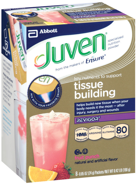 Juven's unique blend of Revigor (source of HMB, an amino acid metabolite), Arginine and Glutamine - naturally existing in the body - is clinically shown to begin to support building tissue. Revigor helps produce new tissue by slowing muscle breakdown and enhancing protein synthesis. Arginine is an amino acid that promotes nutrient rich blood flow and is a building block for proteins which can contribute to healing. Glutamine is an amino acid that helps cells produce the building blocks needed for new tissue. Contains no fruit juice.