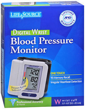 For self-monitoring blood pressure. This digital monitor brings convenient one touch blood pressure monitoring to your home. Just press the start button to automatically inflate the cuff and begin measurement. Pressure Rating Indicator displays the correct color coded category the measurement falls under to assist in understanding and achieving accurate results. Alerts you of the presence of an irregular heartbeat and provides blood pressure and pulse rate measurements even if an irregular heartbeat occurs. Display average readings - calculates the average of the total readings stored in memory; a convenient way to get a snapshot of your overall blood pressure health. 90 memory recall. Wrist cuff measures 5.3-8.5 inches (13.5-21.5 cm). Blood pressure measurements determined with this device are equivalent to those obtained by a trained observer using the cuff/stethoscope auscultation method within limits prescribed by the American National Institute (ANSI/AAMI SP10) for electronic sphygmomanometers. Contains: 1 monitor; 1 carrying case; 1 bilingual manual with blood pressure log sheets (English and Spanish); 1 quick start card; 2 AAA batteries.