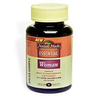 Complete Multi Vitamin/Mineral Supplement with High Levels of Calcium and Iron and with Lutein. Nature Made knows that women have special health needs. The scientists at Nature Made have formulated Essential Woman with those needs in mind. 250 mg of Calcium which may help prevent Osteoporosis (50% more calcium than leading standard multivitamins); Adequate Calcium in a healthful diet is important for teen, young adult and postmenopausal women; High level of Iron which is important for women under 50; 100% Daily Value of Folic Acid. Try taking Nature Made Vitamin C, E and Calcium in conjunction with your Nature Made Multi Vitamin/Mineral for extra daily nutritional support. Nature Made Essential Woman is a complete Multivitamin with 26 key vitamins and minerals necessary for good health. Nature Made scientists have developed this formula to be rich in: Calcium - Necessary for maintaining healthy bones; Vitamin C - Helps keep the immune system strong; Vitamin E - Maintains heart health; Lutein - Maintains eye health. No artificial colors. No artificial flavors. No preservatives. No chemical solvents, yeast or gluten. Oil- and Water-soluble Vitamins with Minerals Tablets made to USP and Nature Made's guaranteed purity and potency standards. Recommended by pharmacists. (These statement have not been evaluated by the Food and Drug Administration. This products is not intended to diagnose, treat, cure or prevent any disease).