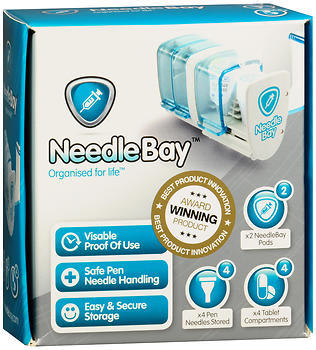 All-in-one organisation and control of your diabetes medication. Visible proof of use. Safe pen needle handling. Easy & secure storage. Pen needles securely held. Compatible with most pen needles. Contains: 2 NeedleBay pods, 4 pen needles stored, 4 tablet compartments.