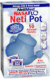NeilMed NASAFLO Neti Pot 'no spill' design is equipped with a removable lid to prevent any spills from occurring from the top of the pot. This patented lid contains a tiny opening that allows the user to control the flow of solution into the nasal passages. NeilMed NASAFLO Neti Pot comes with 50 packets of a precisely measured mixture of USP grade (99.9% pure), preservative free sodium chloride and sodium bicarbonate mixture. Adding one packet of this patented mixture to 8 oz. (240 mL) of lukewarm water, makes a non burning, non stinging, soothing therapeutic solution that gently washes the nasal passages. The device allows for a smooth gravity flow that does not create any pressure in the nasal passages, ears or sinuses. This box also contains an extensive, illustrated, educational brochure on nasal and sinus disease, written by a Physician. Contents: 1 NASAFLO Neti Pot, irrigation device - 8 oz. (240 mL), 50 packets of USP Grade (99% pure) sodium chloride and sodium bicarbonate mixture (pH balanced, natural ingredients, isotonic, preservative free and iodine free), educational brochure, directions for use.