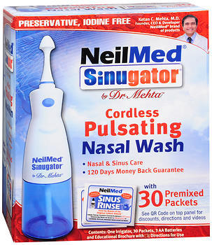 Nasal & Sinus Care. Nasal irrigation involves flushing the nasal passages with a saline solution. By washing away excess mucus, as well as allergens, nasal irrigation can reduce inflammation and relieve congestion, runny nose and post-nasal drip. An easy to use system that allows you to deliver the saline solution with positive and pulsatile pressure to clean the nasal passages thoroughly, while maintaining your head in an upright position. You have complete control, ensuring a gentle, soothing and therapeutic experience. #1 Physician recommended system. Use for: post nasal drip, nasal dryness from occupational and house dust, fumes, animal dander, grass, pollen and smoke. Advantages: soothing, no burning or stinging, large volume and low pressure system for saline nasal irrigation, moisturization & daily nasal hygiene; preservative, drug, iodine, BPA, gluten and latex free; premixed packets of USP Grade Sodium Chloride & Sodium Bicarbonate (purity level 99% or higher); excellent cleansing prior to spraying nasal corticosteroids; pH balanced and isotonic or hypertonic with two or more packets; pulsatile flow; suitable for use after sinus surgery and during pregnancy, consult your physician with concerns. 120 days money back guarantee.