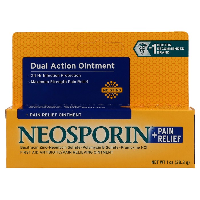 Bacitracin Zinc, Neomycin Sulfate, Polymyxin B Sulfate, Pramoxine HCI. Soothes painful cuts, scrapes and burns while preventing infection. No. 1 doctor recommended brand. Maximum strength pain relief. Every cut. Every time. Soothes the pain of burns. Suitable for your whole family (ages 2 and up). No other triple antibiotic ointment kills more types of bacteria.