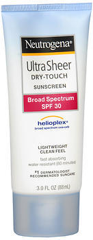 Neutrogena Ultra Sheer Sunblock is a breakthrough in sun protection. It protects with advanced broad-spectrum UVA/UVB protection - and combines it with Dry Touch Technology to provide an ultra-light, non-shiny finish. This lightweight sunblock absorbs quickly and has a light, fresh scent. The non-oily formula is enriched with anti-oxidant vitamins A, C, and E to help fight against environmental damage. Waterproof, sweatproof, resists rub-off. Non-comedogenic (won't clog pores). Light, fresh scent. PABA-free.
