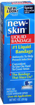 First aid to help prevent bacterial contamination in minor cuts and scrapes. New-Skin Spray is for larger areas, such as legs and arms. New-Skin dries rapidly to form a tough protective cover that is antiseptic, flexible, waterproof and lets skin breathe. Completely covers the entire wound to keep out dirt and germs. Try New-Skin Liquid for smaller areas. Protects cuts and scrapes. Prevents and protects blisters. Helps prevent the formation of calluses. Covers painful hangnails. Particularly useful for bowlers, golfers, tennis players, fishermen and musicians.
