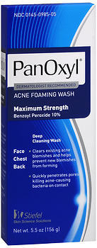 For the treatment of acne. Now you can take control of your acne with Maximum Strength PanOxyl Foaming Wash, the highest strength of Benzoyl Peroxide (BPO) available without a prescription. The Benzoyl Peroxide in PanOxyl Acne Foaming Wash is the same medicine prescribed by dermatologists. The rich elegant lather of PanOxyl Acne Foaming Wash gently removes dirt and excess oil to cleanse and unclog pores, making it an excellent choice for the management of acne on the face, chest and back.