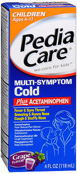 Temporarily relieves the following cold/flu: minor aches and pains; headache; sore throat; stuffy nose; cough; sneezing and runny nose. Temporarily reduces fever. PediaCare medicines are specially developed for kids and provide safe and effective relief for your child's cough, cold, fever, and allergy symptoms. Children ages 4-11. Dosage cup provided.
