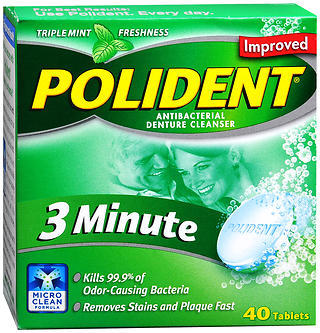 Daily Use: 1. Drop one Polident tablet into enough very warm water to cover denture or partial. 2. After soaking for 3 minutes, for best results, brush denture with Polident solution. Discard remaining solution after brushing. 3. Rinse thoroughly with running water. Keep tablets in a cool, dry place.