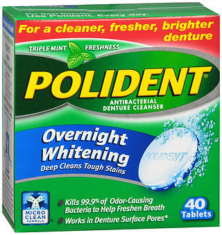 Important: Read all directions before use. Daily use: 1. Drop one Polident tablet into enough very warm water to cover denture or partial. 2. After soaking overnight, for best results, brush denture with Polident solution. Discard remaining solution after brushing. 3. Rinse thoroughly with running water. Keep tablets in a cool, dry place.