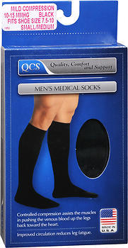 Controlled compression assists the muscles in pushing the venous blood up the legs back toward the heart. Improved circulation reduces leg fatigue. Men's medical socks are fashioned with controlled compression, which assists the muscles in pushing the venous blood up the legs back toward the heart. Improved circulation thus reduces leg fatigue. In addition, they meet the needs of the active man. Provide long lasting support for the most demanding of lifestyles. 10-15 mmHg. Small/Medium fits shoe size 5 - 10, ankle 7 - 10 inch, calf circumference 11-1/4 - 15 inch.
