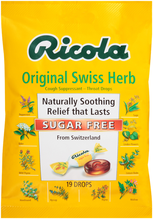 Temporarily relieves: cough due to a cold or inhaled irritants; occasional minor irritation and pain due to sore throat or sore mouth. Ricola Sugar Free Mountain Herb is the sugar free version of Ricola's famous Original Herb Cough Drops, made today just as they were in the 1930s using the highest quality natural herbs culvitated in Swiss alpine areas to ensure optimum taste and effectiveness. Herbs have been used around the world for centuries. For over 75 years, Ricola has been making pleasant tasting natural herbal products for natural relief of the discomfort due to sore throat and minor irritation due to coughs, hoarseness, dry throat, and loss of voice. Ricola is nature's way of calming coughs and soothing sore throats. Product may be useful for diabetics on the advice of a doctor.