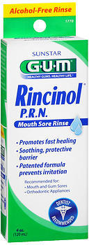 Dentist and Pharmacist recommended for pain caused by: canker sores, mouth sores, denture irritation, braces, oral surgery. Introducing the pain-free way to relieve canker and mouth sore pain. No harsh hydrogen peroxide or painful benzocaine which means no numbing, stinging, or burning. Rincinol P.R.N. gently forms a micro-thin, invisible, bioadhesive protective barrier over sores which promotes healing and prevents air, liquid, and food from irritating the sensitive nerve endings. This soothing oral rinse provides up to 6 hours of pain relief. Safe for children.