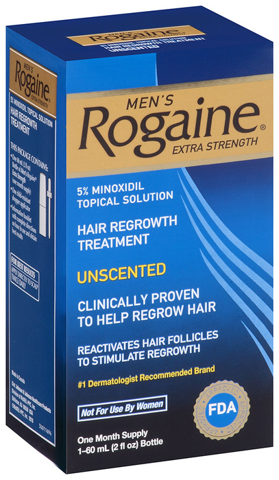 To regrow hair on the scalp (vertex only, see pictures on side of carton). For men who have a general thinning of hair on the top of the scalp. Unscented. Clinically proven to help regrow hair. Revitalizes hair follicles. #1 dermatologist recommended brand. One month supply. This package contains: One 60 mL (2 fl oz) bottle of Men's Rogaine Extra Strength (one month supply). One child-resistant dropper applicator. Information booklet with complete directions on how to use and obtain best results.