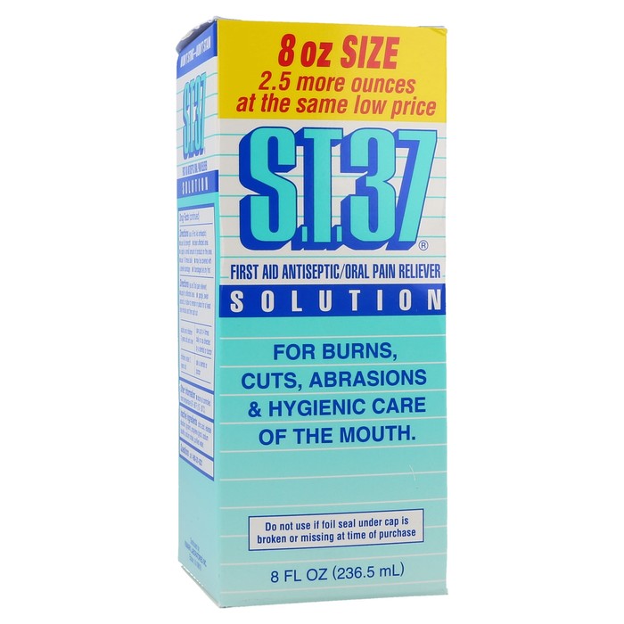 Temporarily relieves: minor irritations of the mouth; minor pain in the mouth; sore mouth, sore throat; first aid to help prevent skin infection in minor cuts, scrapes, and burns. S.T.37 kills common pathogenic bacteria quickly on contact! Laboratory tests have established S.T.37 antiseptic solution as a general antiseptic for household use. S.T.37 is pleasant to use because it produces little or no stinging or burning. In fact, it soothes irritated areas. S.T.37 does not stain the skin or leave an odor.