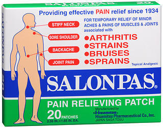For temporary relief of minor aches and pains of muscles and joints associated with: arthritis, simple backache, strains, bruises, sprains. The history of medicated patches in Japan reaches back to the 18th century. HISAMITSU inherited this tradition and has worked on improving it since the company was founded in 1847. Salonpas was first introduced in 1934 and is now available in over 50 countries worldwide. Salonpas launched in the United States in 1987 and has been gaining popularity ever since. Patches measure 2.56 in x 1.65 in each.