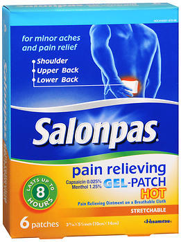 For temporary relief of minor aches & pains of muscles & joints associated with: simple backache, arthritis, strains, bruises, sprains. Pain relieving ointment on a stretchable breathable cloth. Patches have rounded corners. For use on shoulder, upper or lower back. Lasts up to 8 hours. 3-15/16 x 5-1/2 inches.
